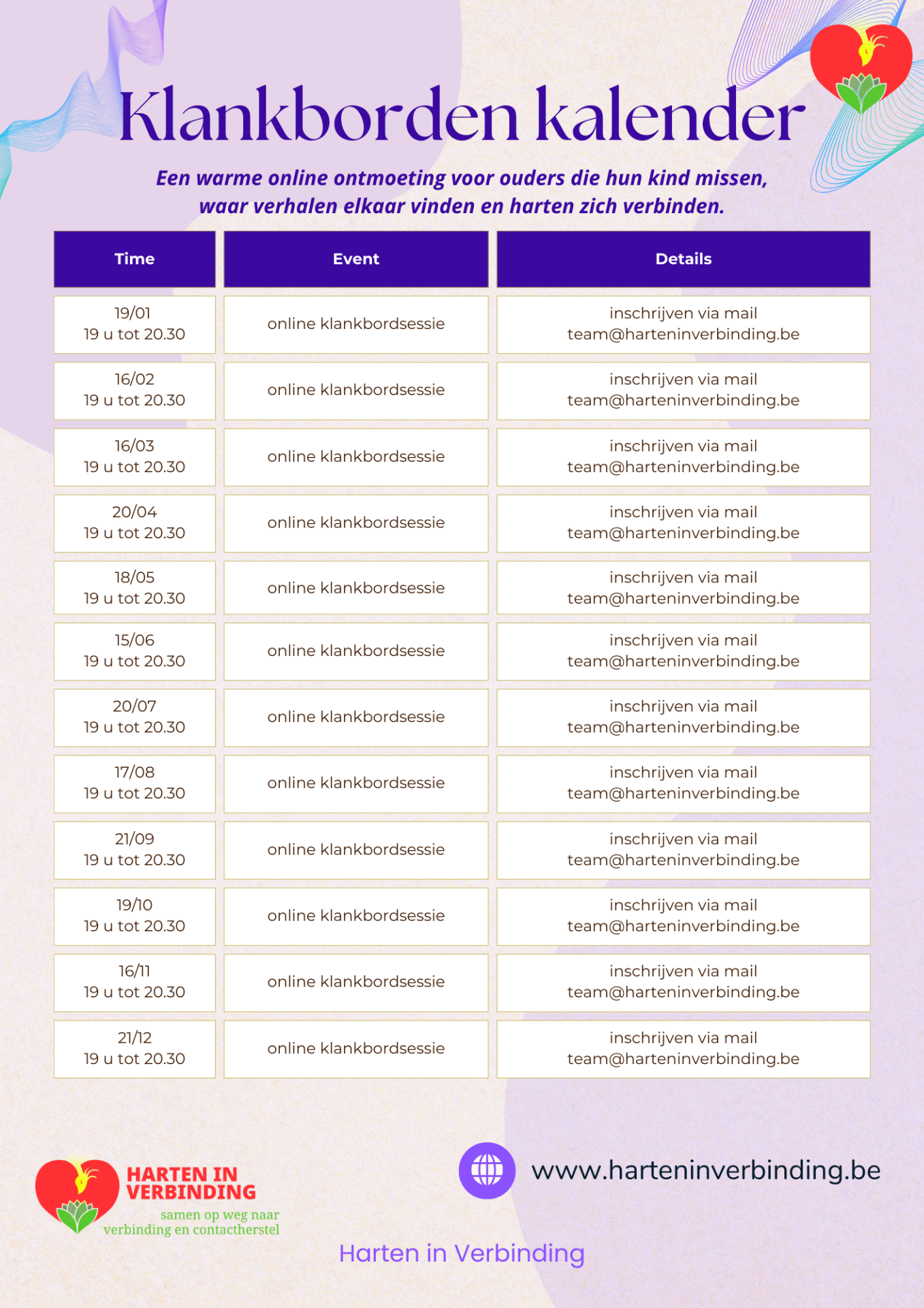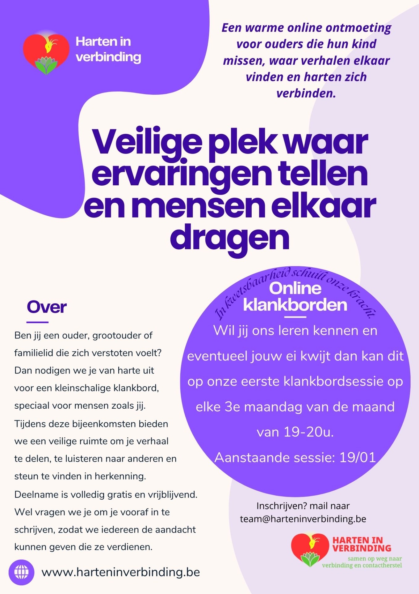 Wil je graag inschrijven, stuur dan een mailtje naar team@harteninverbinding.be